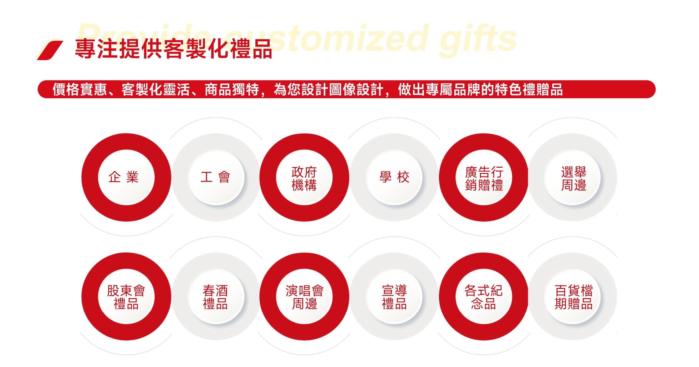 提供企業、工會、政府機關、學校、廣告行銷活動、股東會、百貨檔期等專屬禮品需求。